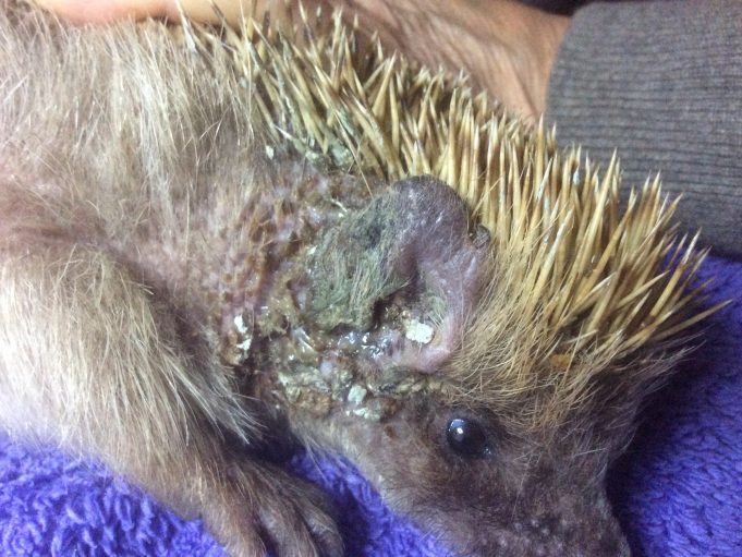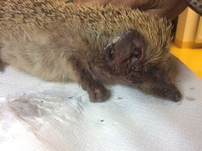 Oreille droite blessée, très enflée, poche de sang et de pus (?) de l’oreille jusque sous le menton. Pleine de puces, quelques tiques. Très amaigrie. Assez âgée.