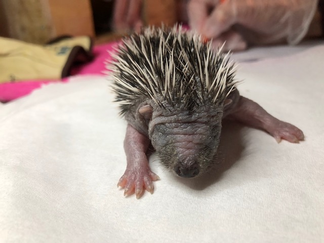 Le 26/04/2019 : Bambou le lendemain, qui a toujours moins d'un jour mais déjà bien changé: ses piquants blancs ont poussé et ses premiers piquants noirs apparaissent