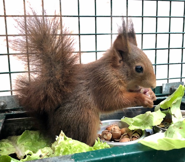 4 juillet. C’est le grand départ pour la liberté. Bilutek sait ouvrir les noisettes vertes de saison. Il est prêt a vivre sa vie d’écureuil libre. Il connait le jardin, et l’a encore prouvé le jour de sa libération. Le centre des hérissons sera toujours sa maison. Il peut revenir dans son nid et il y aura toujours à manger pour lui.