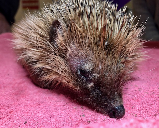 Patte arrière gauche sectionnée. Puces et peut être acariens. Abcès à la mâchoire supérieure.