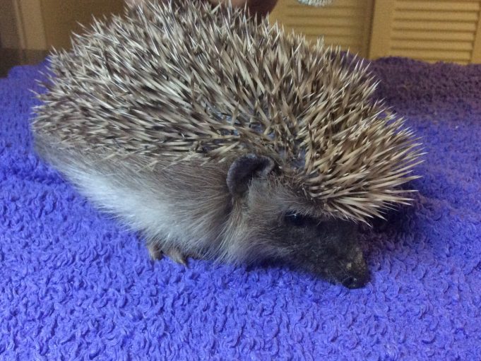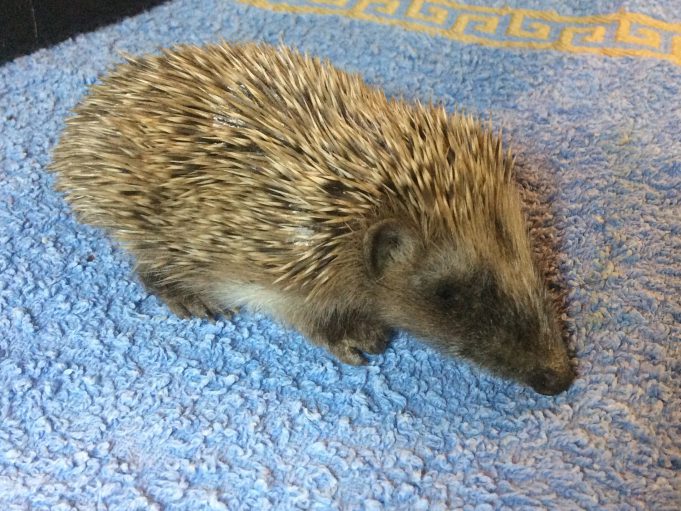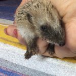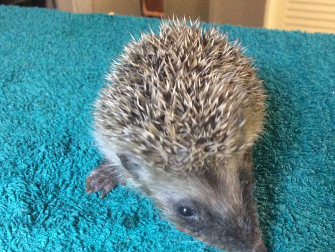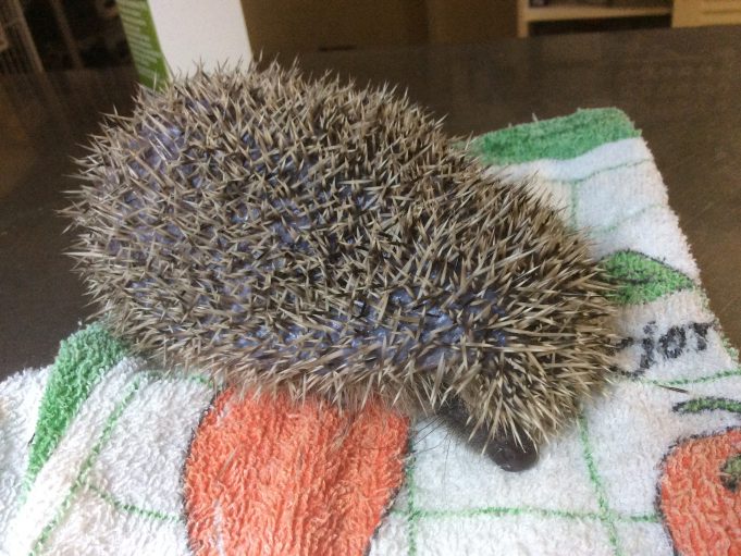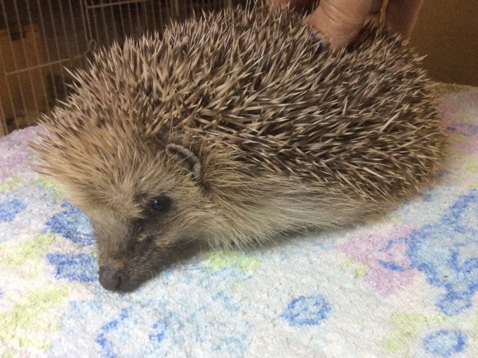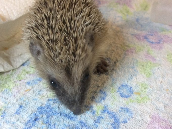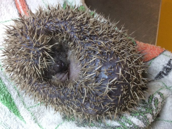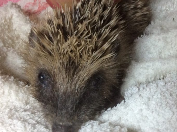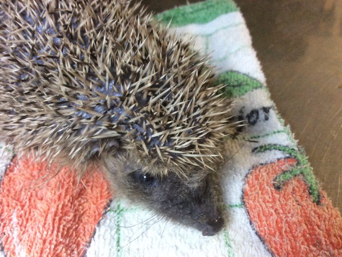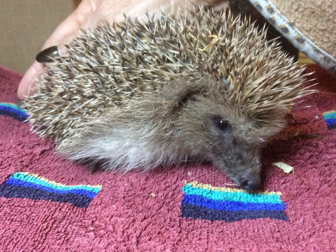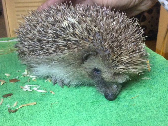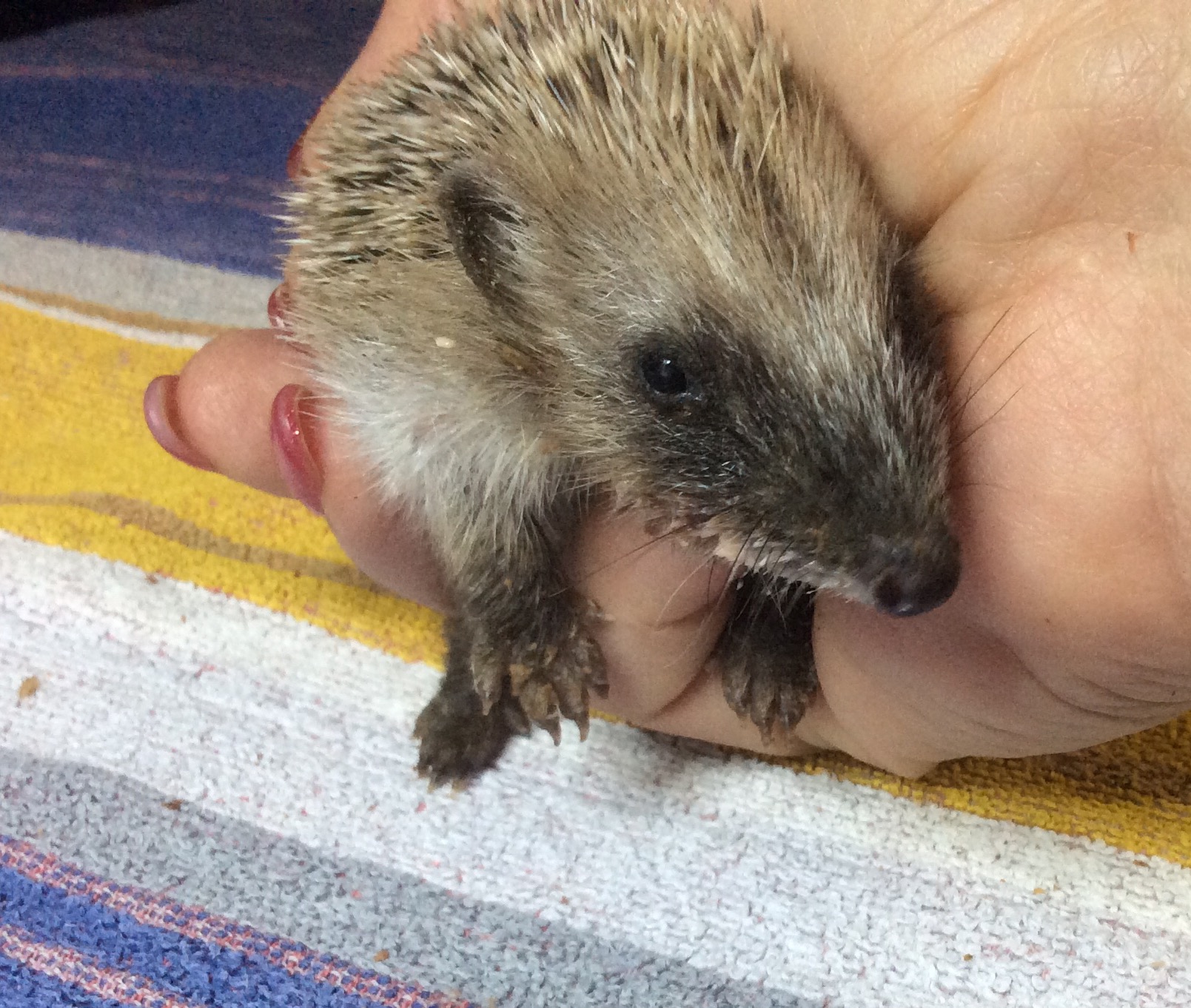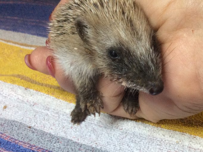 Toute petite hérissonne très maigre et très déshydratée. Pleine de puces. Quelque tiques. Les yeux sont à peine ouverts.