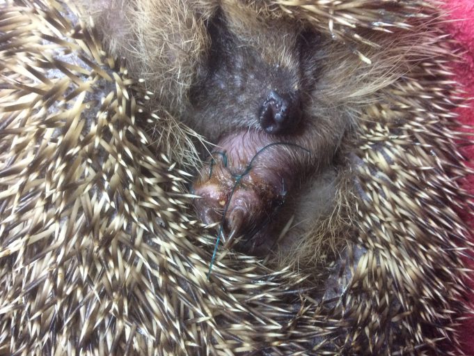 Les blessures aux pattes avant gauche et droite sont profondes et infectées. Elle a dû rester prisonnière de la ficelle plusieurs jours.
