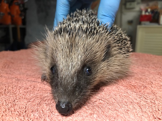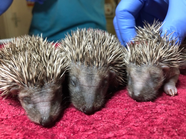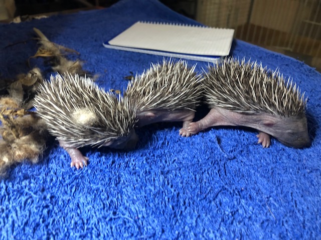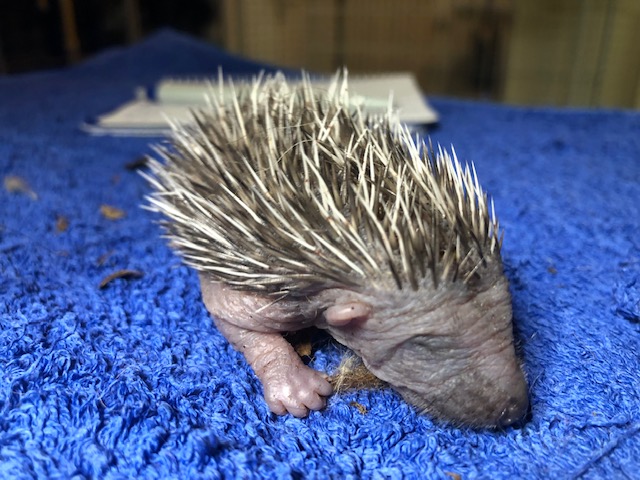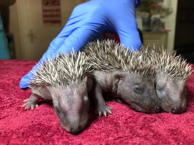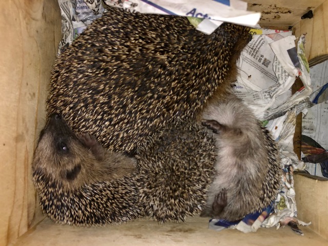 Hérissonne ayant mis bas au fond d’un parking de la rue de l’Orangerie. L’endroit n’est pas idéal et un des 3 bébés est hors du nid.