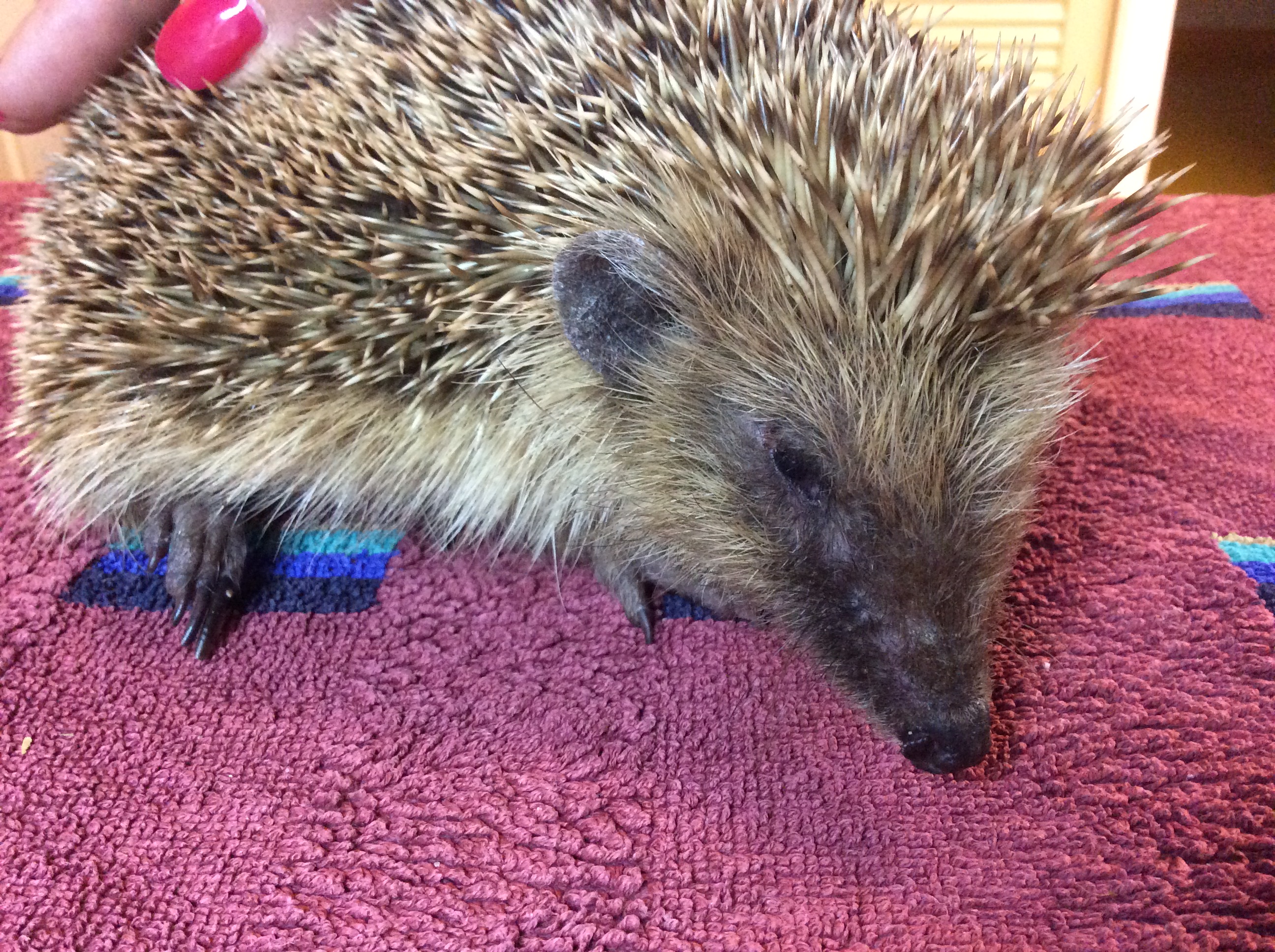 Le hérisson se promène la journée en se frottant le ventre. Elle a mangé et bu des croquettes et de l’eau.