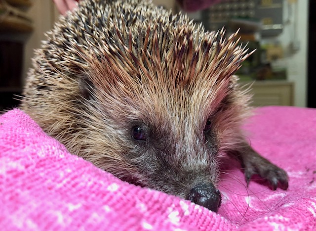 Hérissonne en hibernation trouvée en plein jour sur la rue à côté de la haie qui venait d’être coupée. Impossible de la laisser sur place car il n’y a plus d’endroits où elle puisse s’abriter. Elle est amenée au centre de soins SOS hérissons.