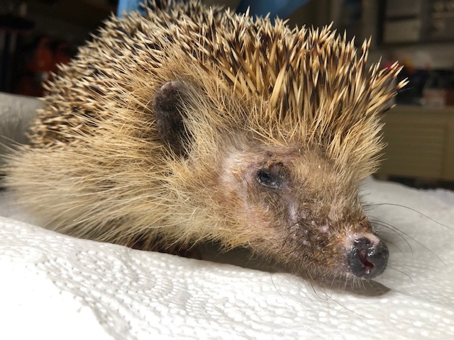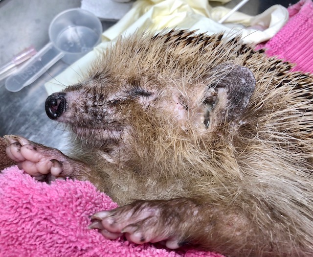 Il a des asticots dans une blessure au dessus de l’oeil droit. Il est couvert de tiques et de puces