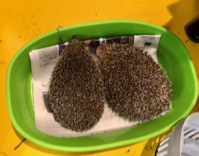 Deux jeunes hérissons trouvés un jour après qu’un gros hérissons (sans doute la mère) ait été retrouvée blessée mortellement. Ils étaient en plein jour sur une place de jeux d’enfants très exposée.