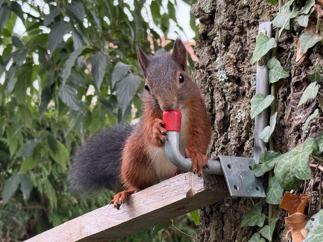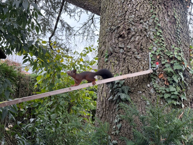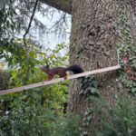 Après être sorti plusieurs fois pour s’entrainer et avoir retrouvé le chemin de la volière (et de la nourriture) tout seul, Fazy peut faire comme il veut. Il est à nouveau libre, ile peut partir très loin ou revenir à la volière comme il veut. Espérons que s’il rencontre Nutkin, l’écureuil femelle, elle tolérera ce petit jeune dans son territoire,