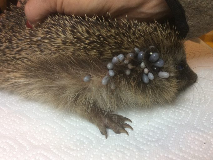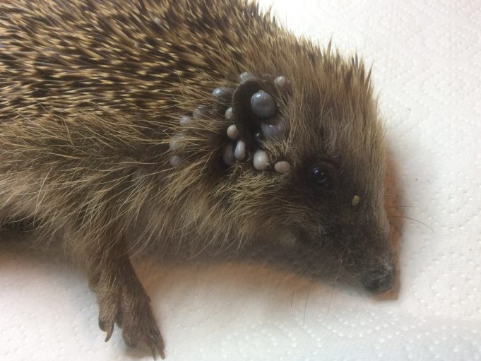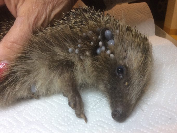 Plein de tiques énormes, très maigre, affamé. Sens de l’équilibre atteint, ne tient pas debout mais mange bien.