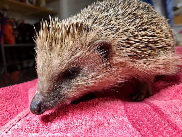Hérisson âgé et amaigri, sans doute à cause des blessures causées par une débroussailleuse. La blessure au flanc droit est importante est pleine d’asticots. Une autre blessure sur le flanc gauche mais moins profonde et un gros abcès sur la tête. Tiques et puces et infection urinaire.