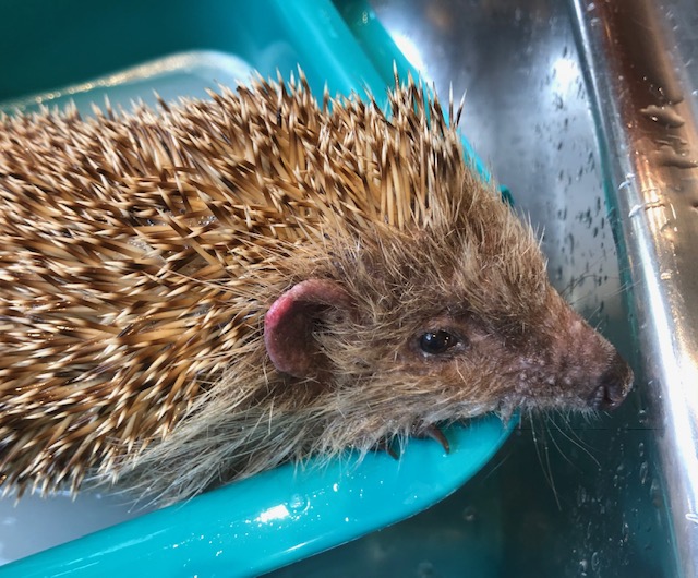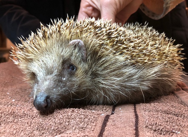 Le 29/12/2018 : A son arrivée, cette hérissonne âgée est très sale et il est difficile de voir si elle a un problème à l'oeil ou pas de même pour la diarrhée.