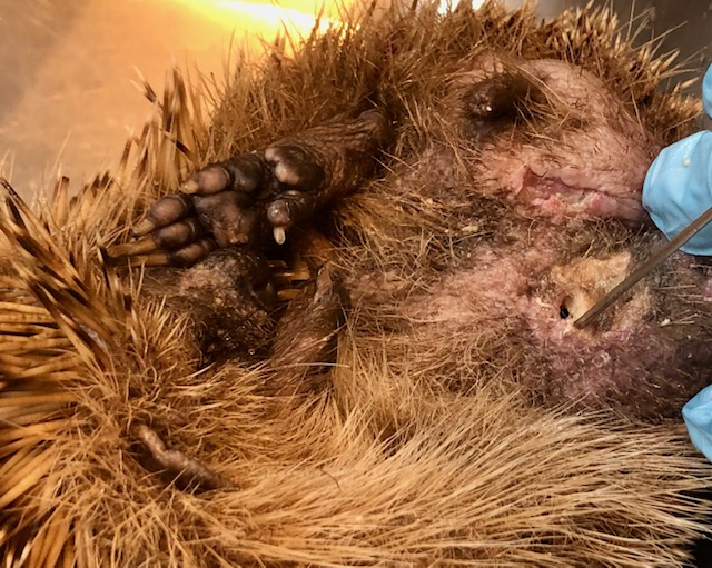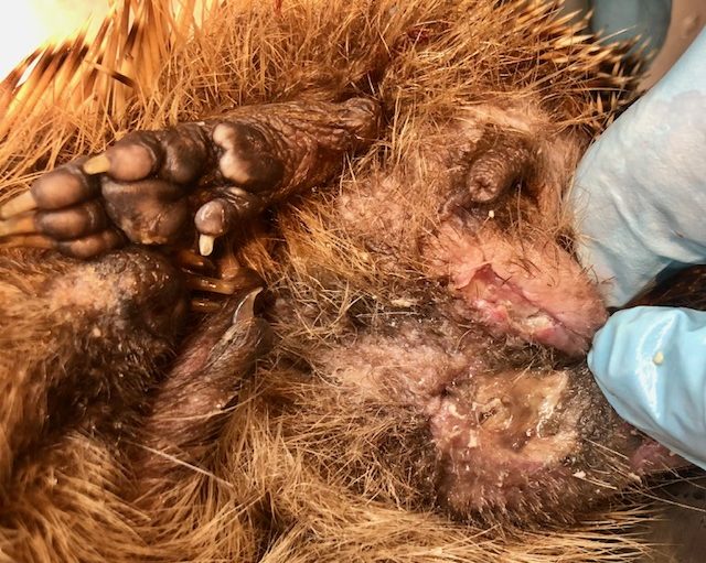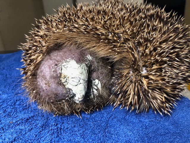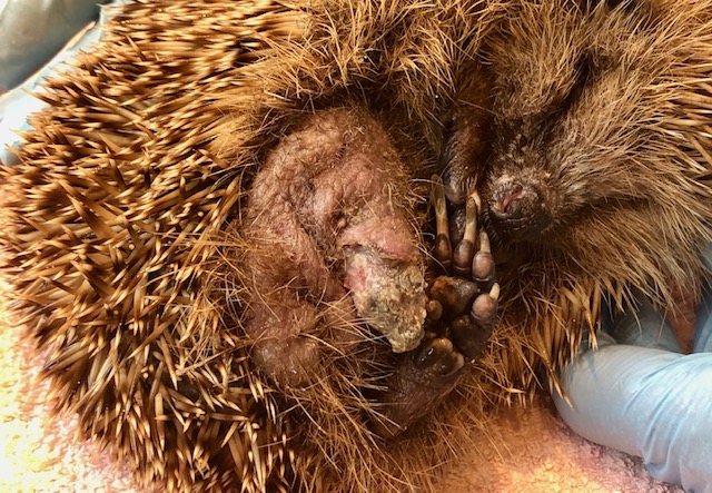 Patte postérieure droite très enflée. Elle est peut être infectée. Vu son point rose et le lieu où il a été trouvé c’est bien possible qu’il s’agisse de Fred.