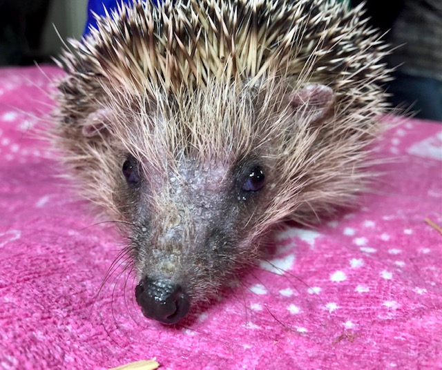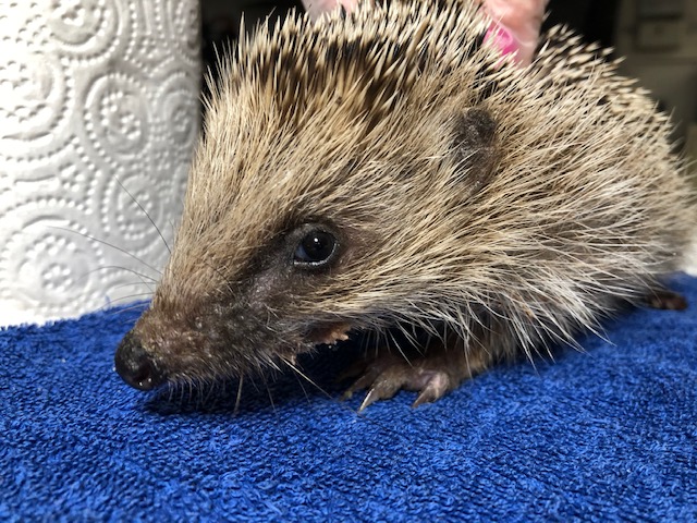 Hérisson trouvé le 17 avril traversant la route en plein jour. Affamé plein de tiques et puces et respirant avec difficulté, il a été recueilli et gardé jusqu’au 30 avril. Il mange et boit mais régurgite et perd du poids. Amené à la Clinique des Tuileries qui l’a confié au centre.