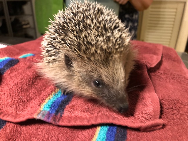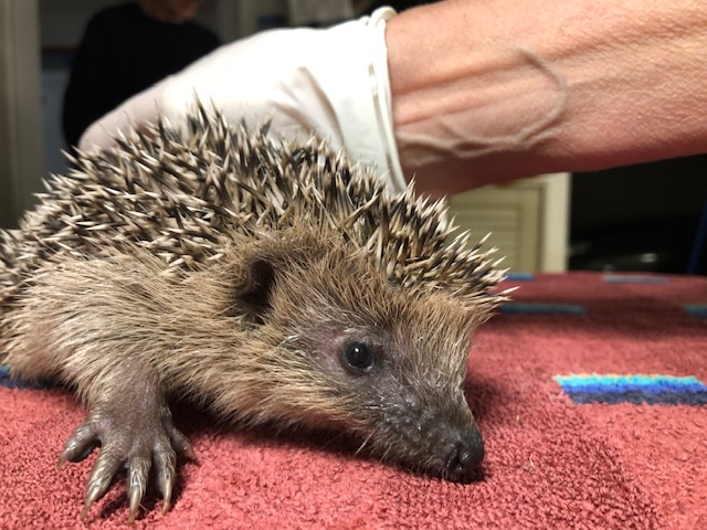 Hérissonne trouvée sur la route totalement désorientée. Prise à la maison et mise sur le balcon, la hérissonne met bas 5 bébés. Toute la famille est apportée au centre juste après.