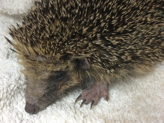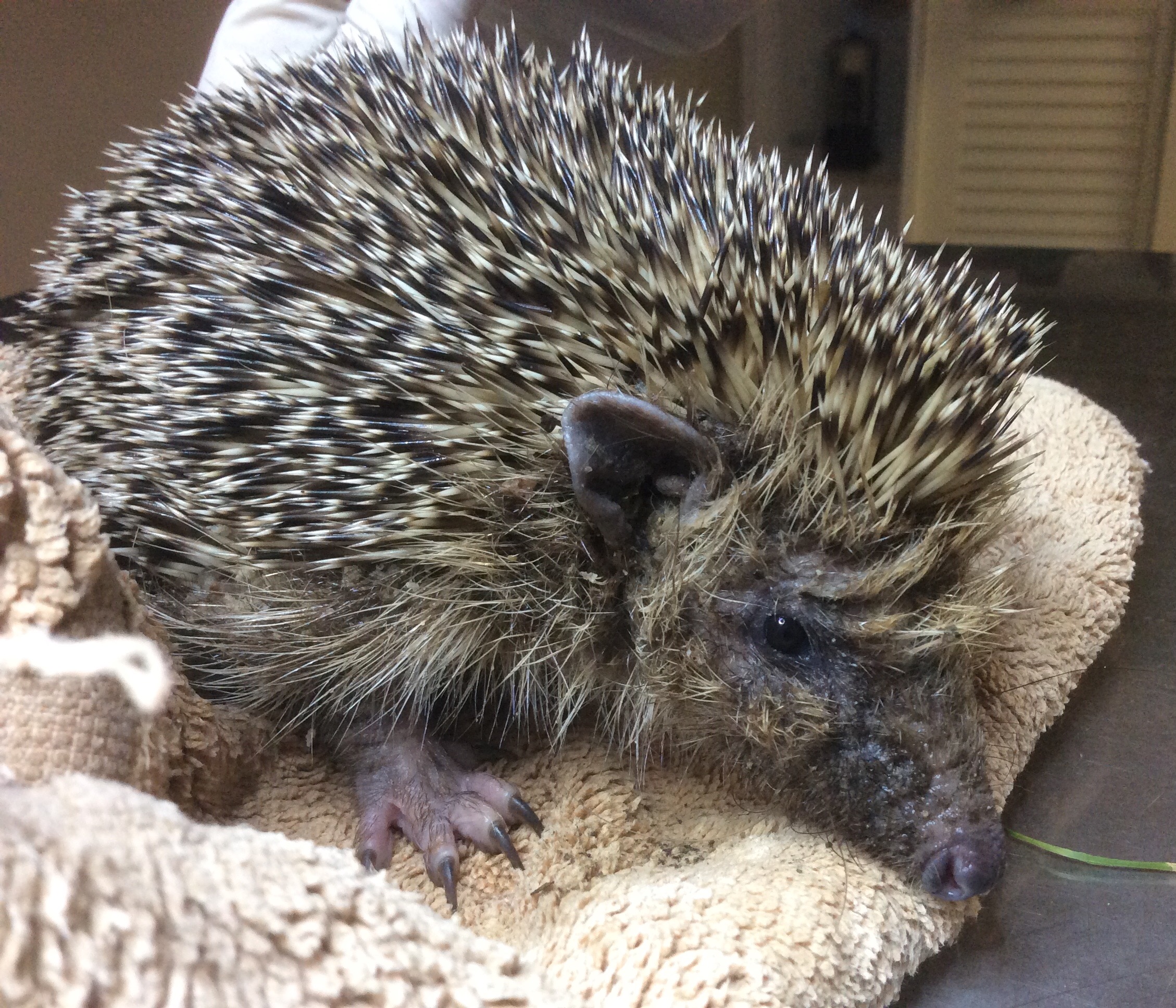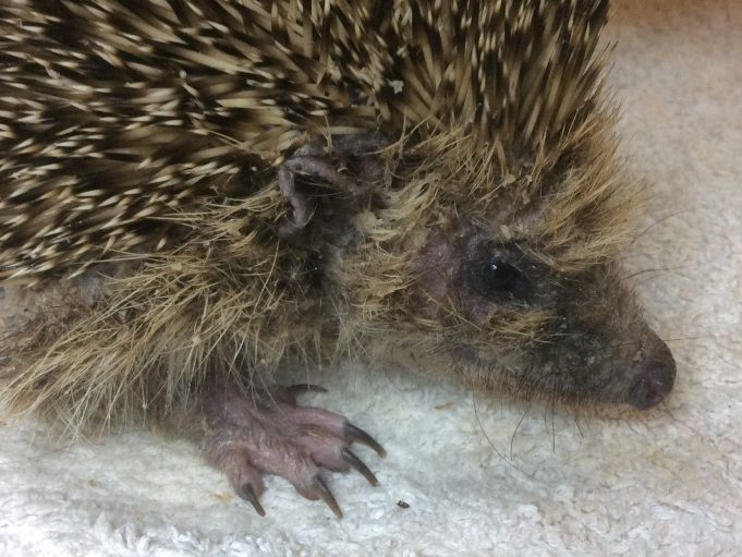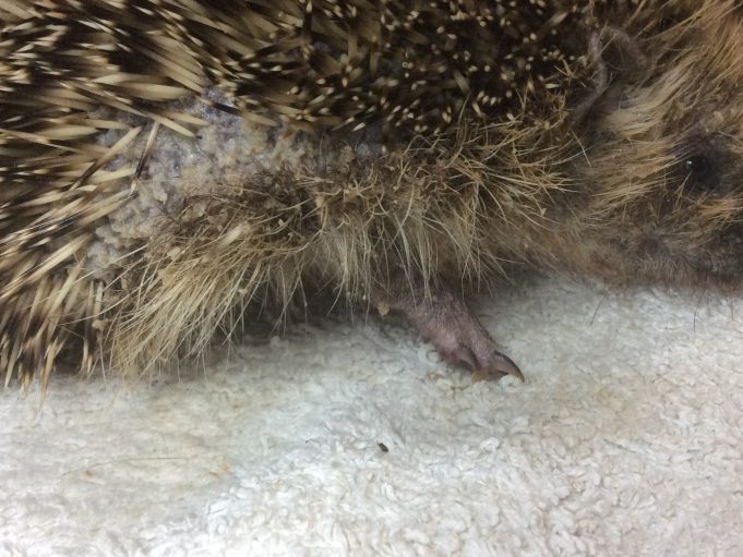 Le 01/05/2016 : Enfin elle se déboule suffisemment pour examiner le ventre. Elles est très atteinte par la teigne.