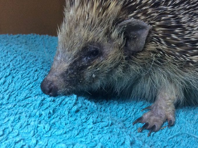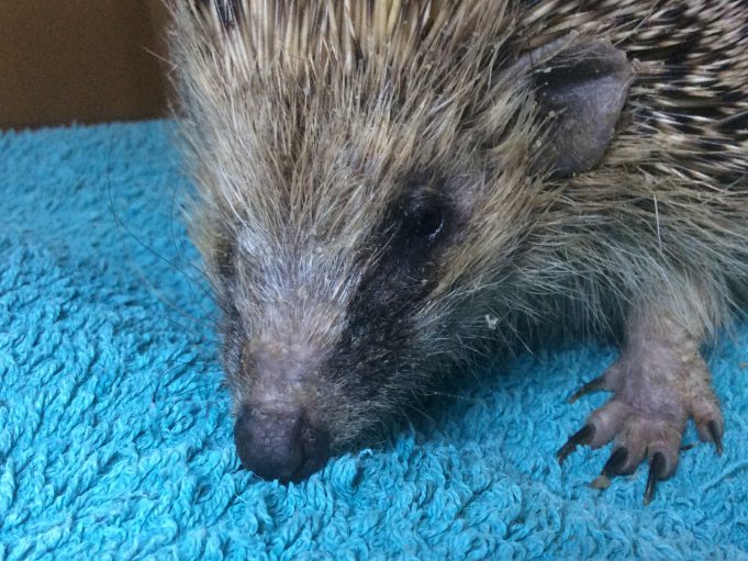 Tiques, puces. Blessure sur le menton. Atteinte de teigne.