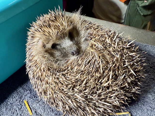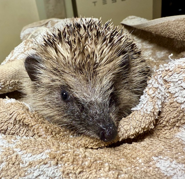 Jeune hérisson trouvé dans un parking de Lancy et apporté au Centre de soins par la Police.