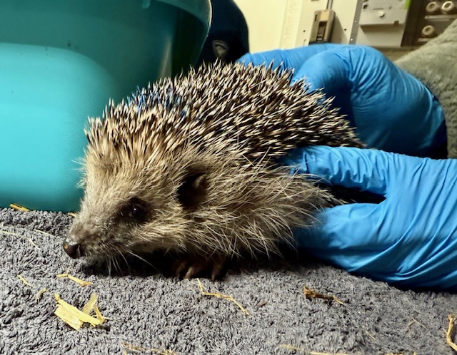 Maman hérisson trouvée avec ses 3 bébés au milieu de la cour entourée par les enfants de l’école primaire de Geisendorf. Une enseignante a appelé le centre et sécurisé la famille en attendant qu’elle puisse être prise en charge.