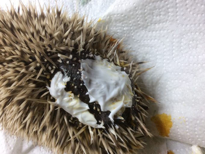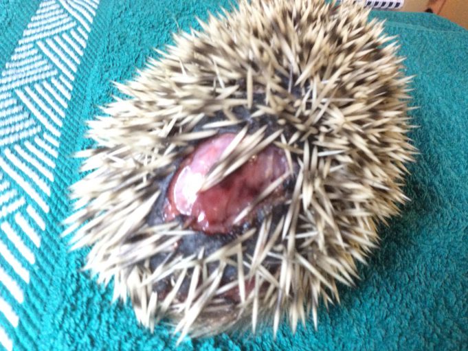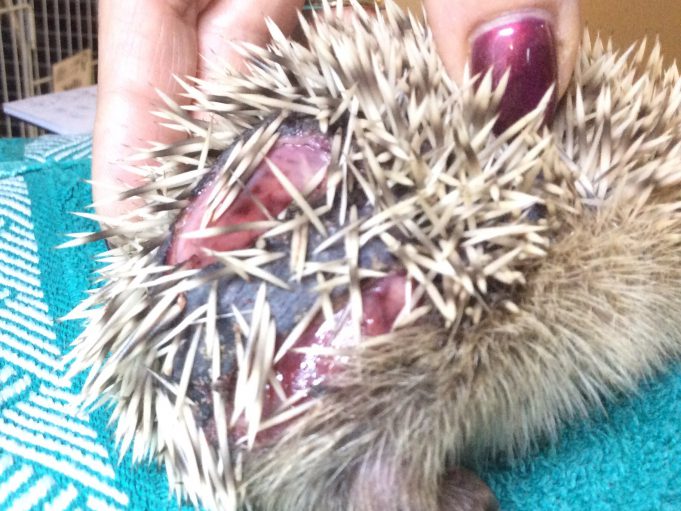 Le 18/06/2016 : Et sur le flanc droit. En plus il a deux morsures profondes. Les piquants doivent être coupés pour bien soigner la plaie