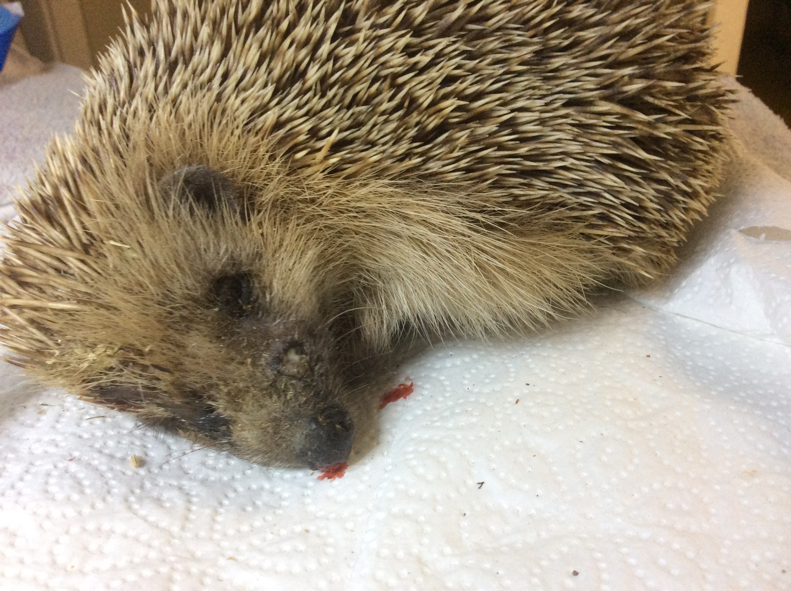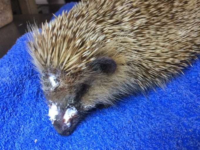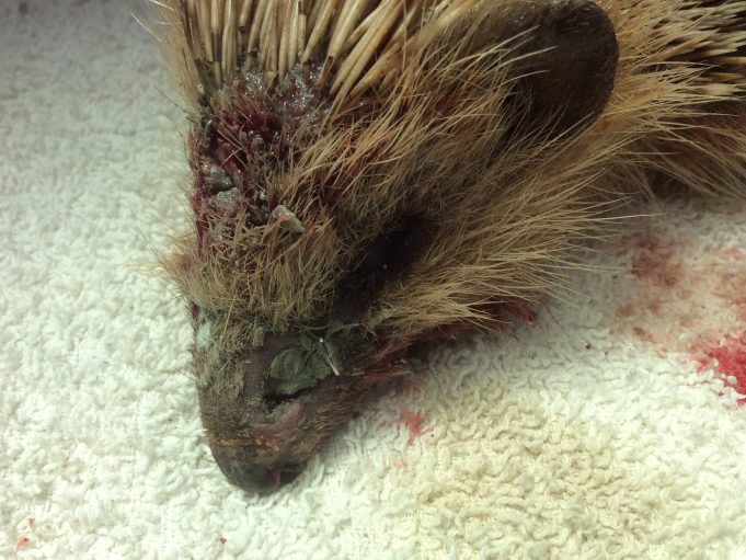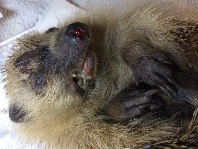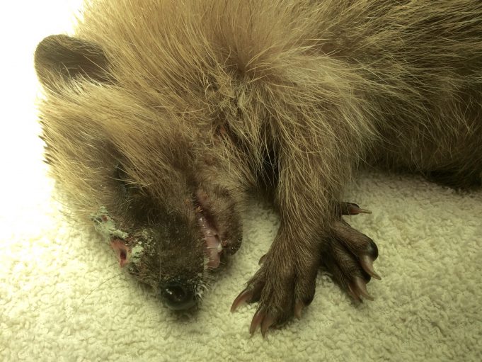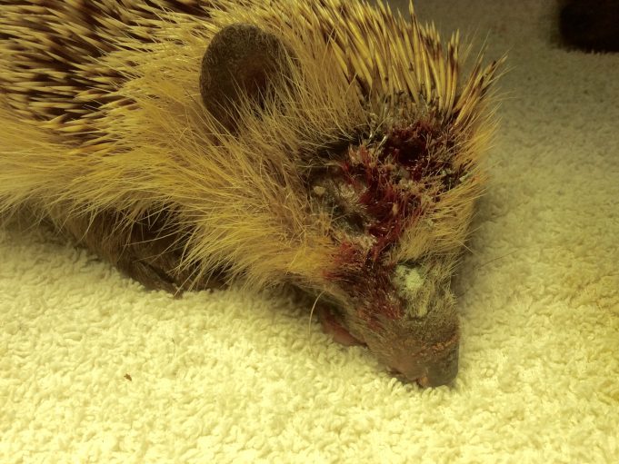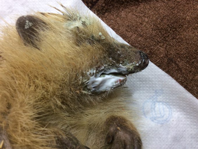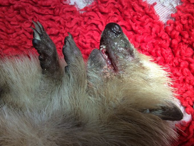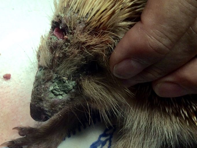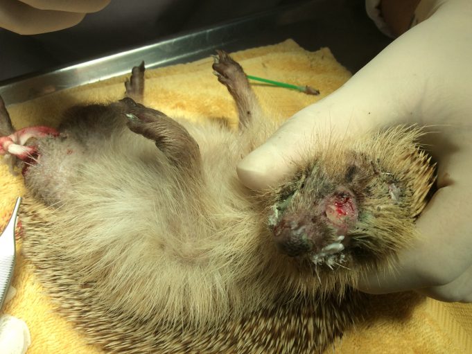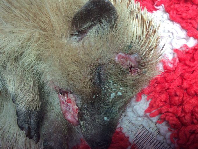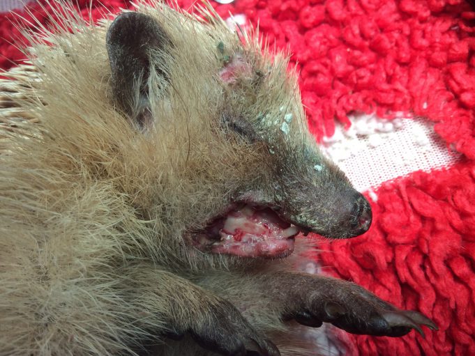 Museau cassé, balafre profonde et infectée sur le front, oeil droit blessé et globe absent, lèvre arrachée, mâchoire infectée et très abîmée. Tiques par centaines, puces. Poche de pus importante sur le museau qui l’empêche de respirer correctement. Asticots mais impossible de savoir d’où ils sont sortis.