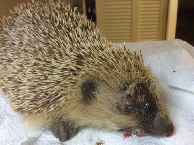 Le 15/07/2016 : L'œil droit est atteint (hors d'usage). Il a une grosse blessure sur la tête La gueule est aussi très abîmée. Museau et gueule infectés, poche de pus sur le museau qui va jusque dans la gueule.