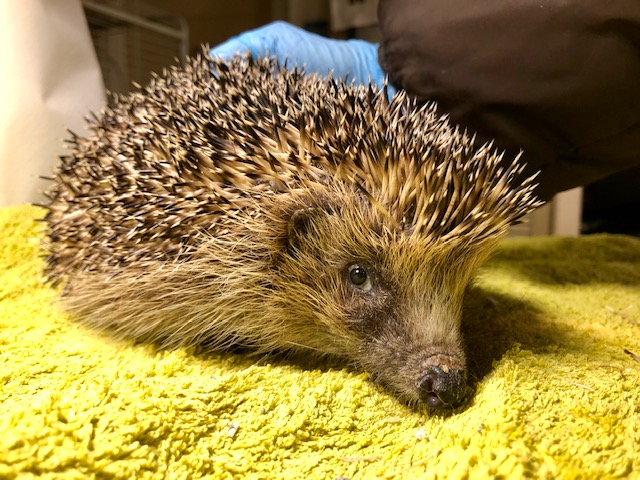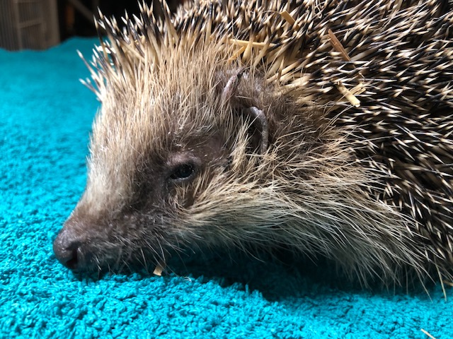 Sang coagulé à l’intérieur des deux oreilles et dans les narines. Ce hérisson a reçu un choc et a peut être des lésions internes. Il marche cependant normalement. Puces et quelques tiques sinon de poids normal pour un mâle adulte.
