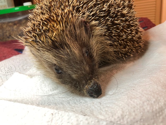 Hérissonne très âgée, très amaigrie, pleine de tiques de toutes les tailles et de puces. Inflammation de l’anus. Respiration très rauque. A peut être des vers pulmonaires ou une infection des poumons.