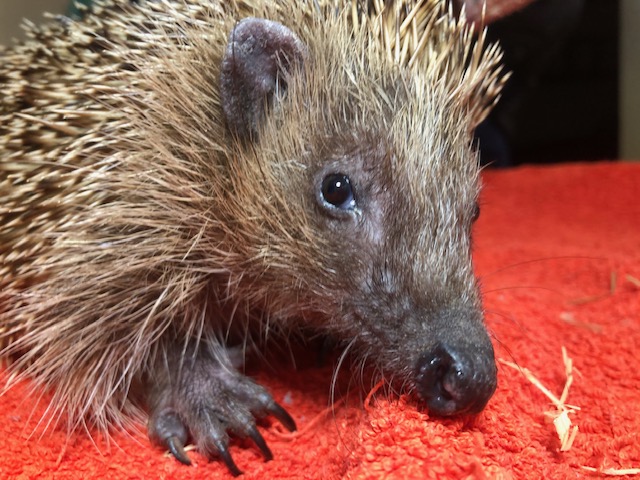 C’est une hérissonne âgée et amaigrie. Elle a en effet la patte postérieure droite blessée mais pas cassée. Par contre la blessure est déjà très infectée. Puces et tiques.