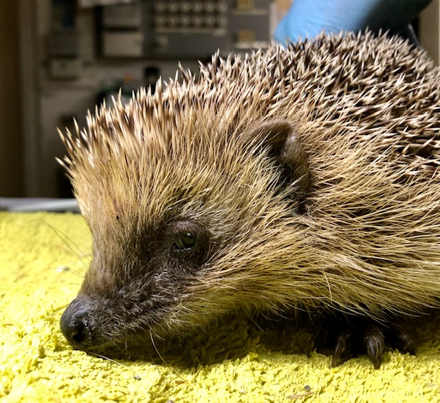 Elle semble avoir subi un choc. Son oreille gauche est plein de sang. Quelques piquants coupés par les corneilles.