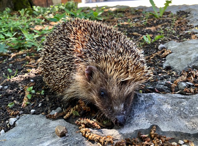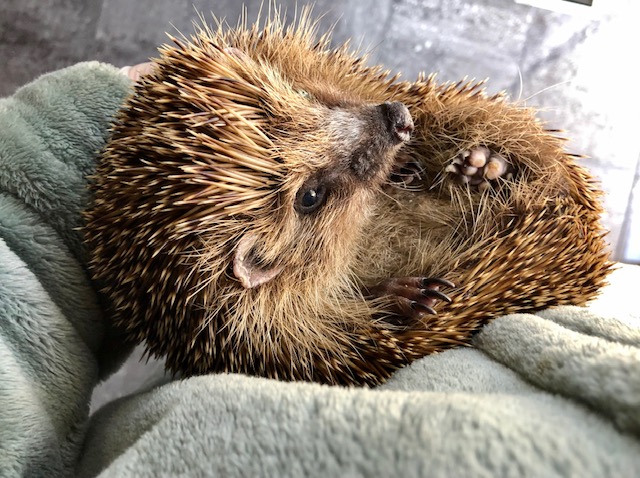 Hérisson trouvé en plein jour à l’entrée du chemin menant à la ferme du Lignon. Apportée au centre par le propriétaire de la ferme (merci)