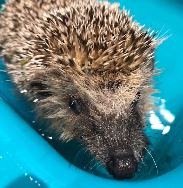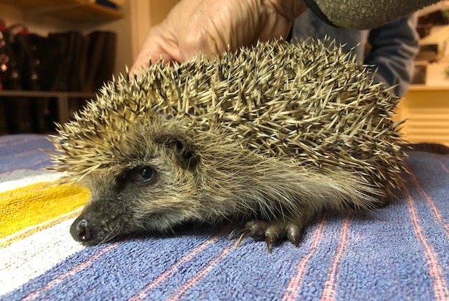 Déterrée de son nid dans la terre par le chien. Après l’avoir gardée un jour et constaté qu’elle mangeait très peu, cette hérissonne a été amenée au centre