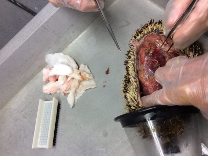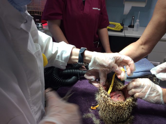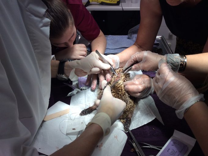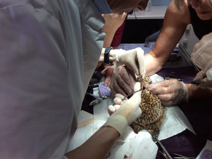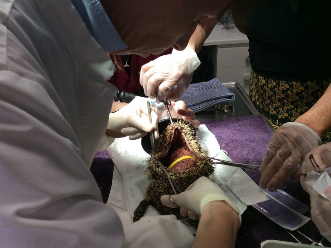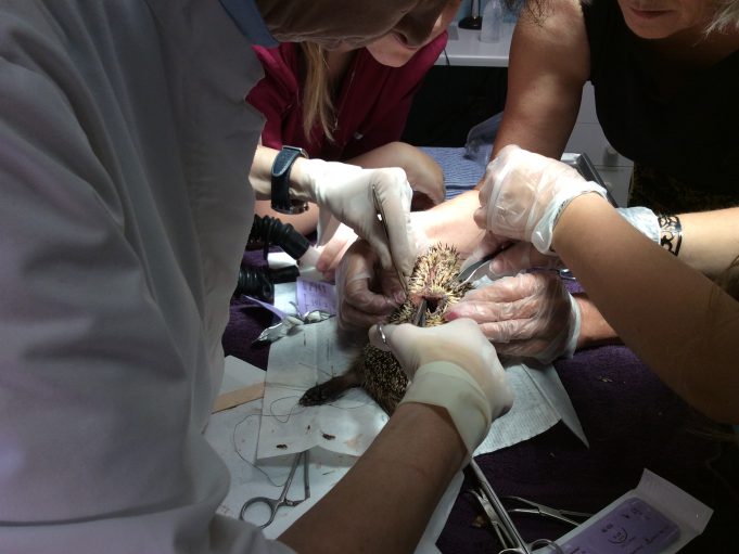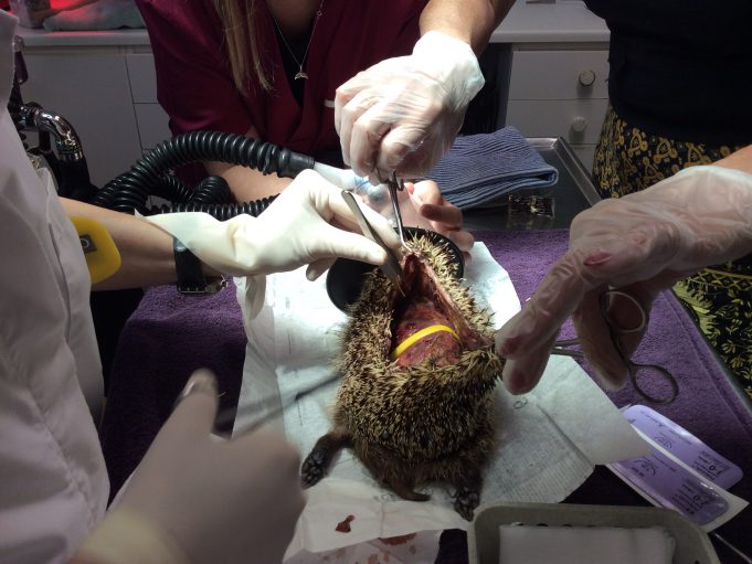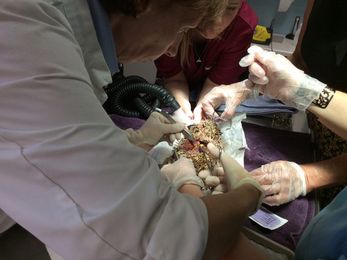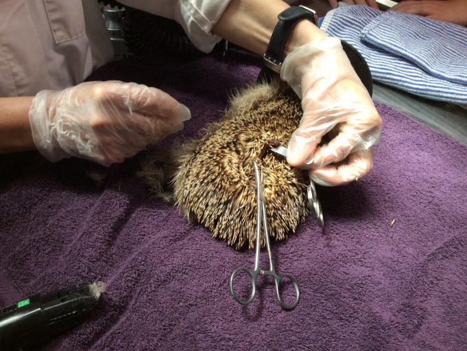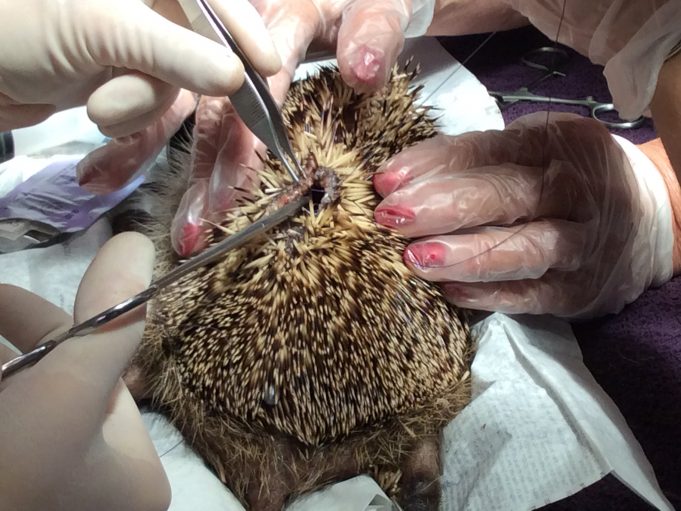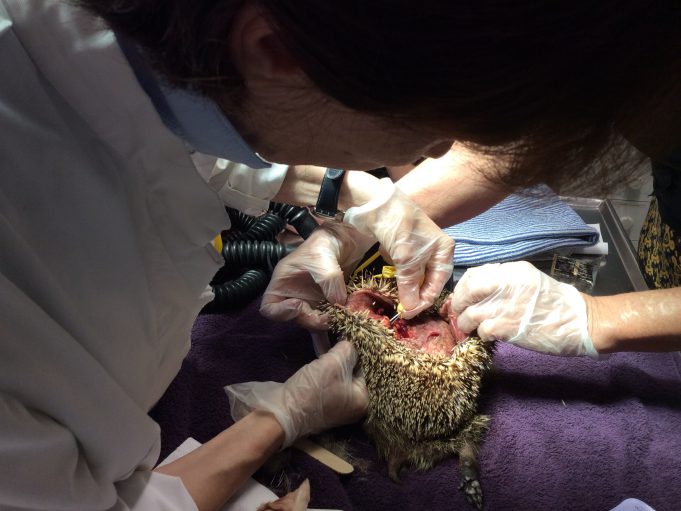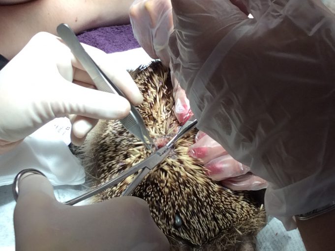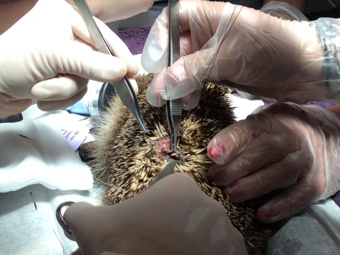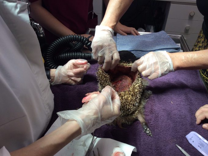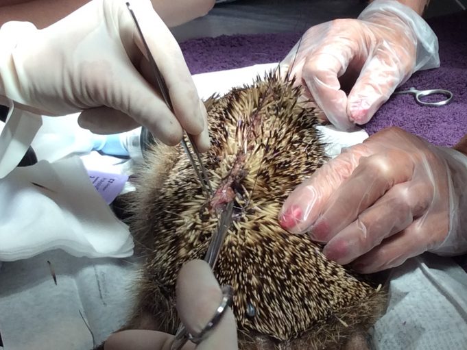 Le 02/08/2018 : Alors que Swissy est endormi, la plaie est nettoyée, frottée, les bords et tissus coupés proprement.