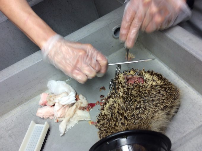 Énorme plaie dorsale, très sale, présence d’oeufs de mouche et déjà d’asticots. Tiques et puces