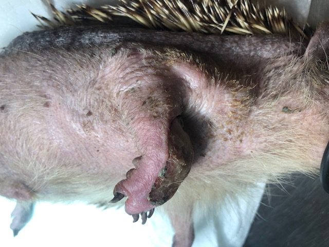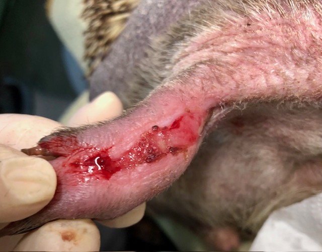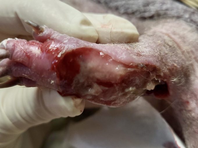 Le 20/11/2023 : Sa patte avant droite est très nécrosée mais peut être sauvable