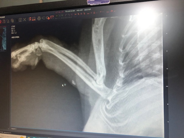 Le 02/12/2023 : La radio révèle des os en bon état mais soudés en position pliée. On espère que les soins permettront à l'immense trou de se refermer.