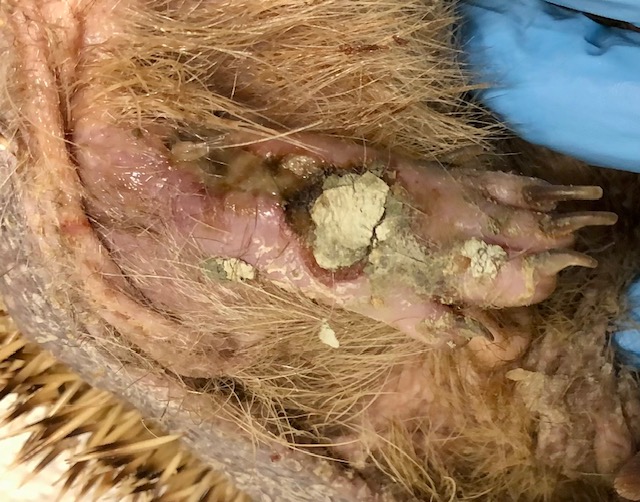 Le 18/11/2023 : Il y a une grosse blessure infectée sous les croutes de mycose sur le front.