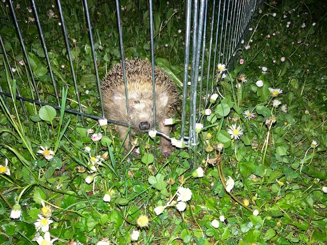 Le 10/05/2022 : Zimut sent d'autres hérissons de l'autre côté de la barrière, il a envie de sortir les rejoindre.