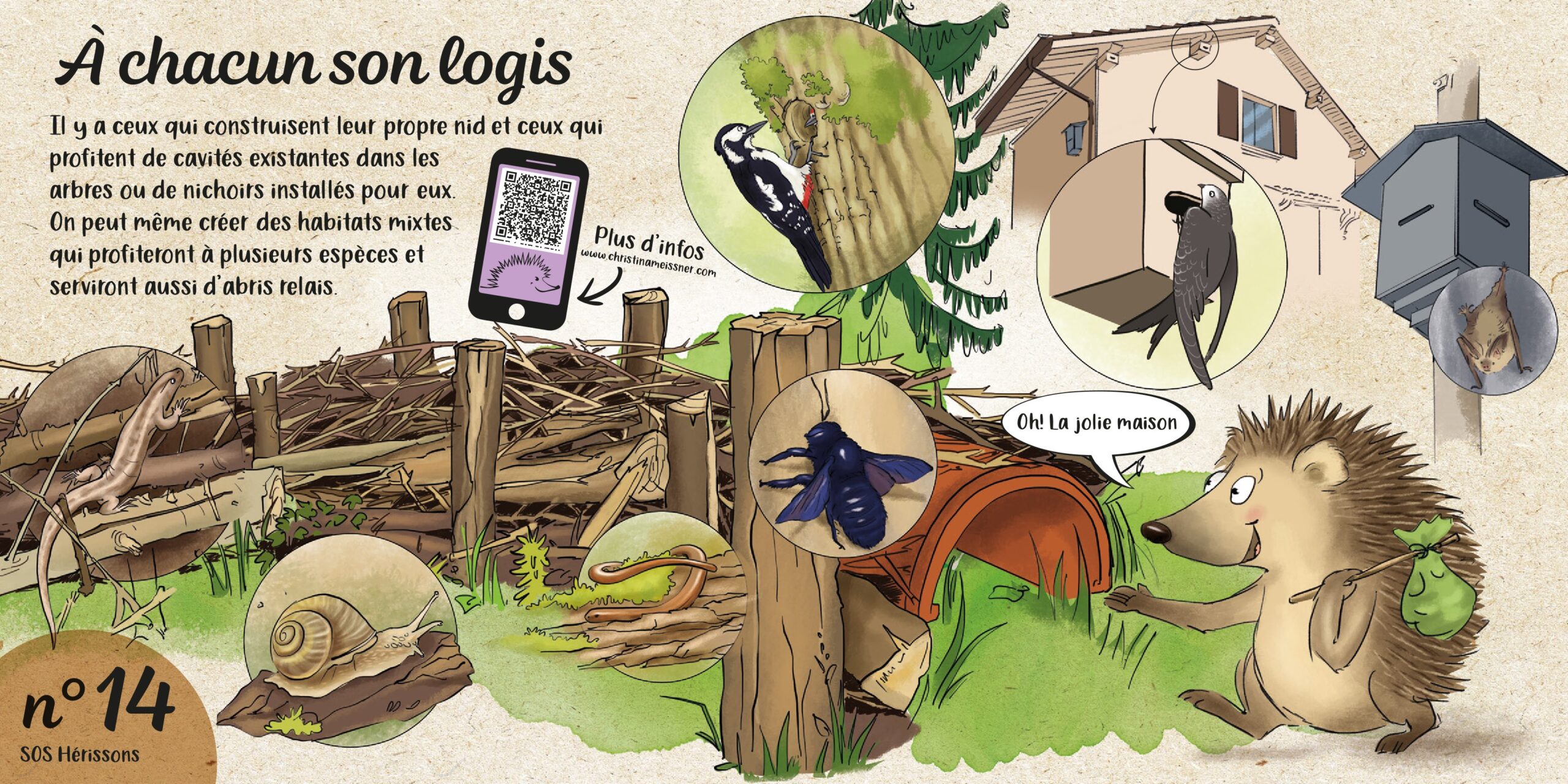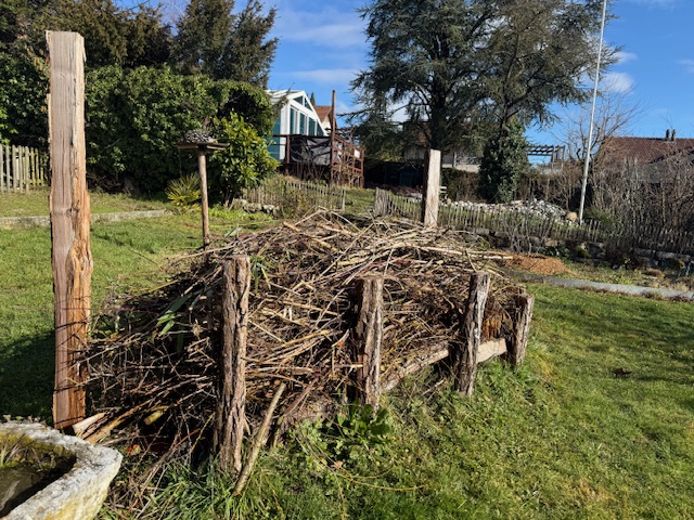 Le hérisson apprécie les branches, bûches de bois et les feuilles mortes pour s’abriter. Vous pouvez les amasser sous forme de tas dans un coin du jardin. Vous pouvez aussi les empiler de manière à créer une barrière naturelle en bordure de propriété ou en faire une forme de « Landart » comme dans le jardin didactique du centre SOS hérissons. Ce biotope relais réalisé avec l’aide du KARCH est ce qu’on appelle un micro-habitat. Quelle que soit la forme choisie, il n’y aura pas que le hérisson qui en profitera mais aussi les lézards, les abeilles sauvages et bien d’autres espèces. Entreposer ainsi les déchets de la taille plutôt que de les évacuer rendra service à la biodiversité de votre jardin.