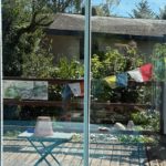 Pour éviter que les oiseaux ne s’écrasent contre les vitres, il faut soit poser des autocollants qui les rendent visibles (voir infos ci-après), soit créer des obstacles (ici des drapeaux flottants et des pots de fleurs grimpantes).