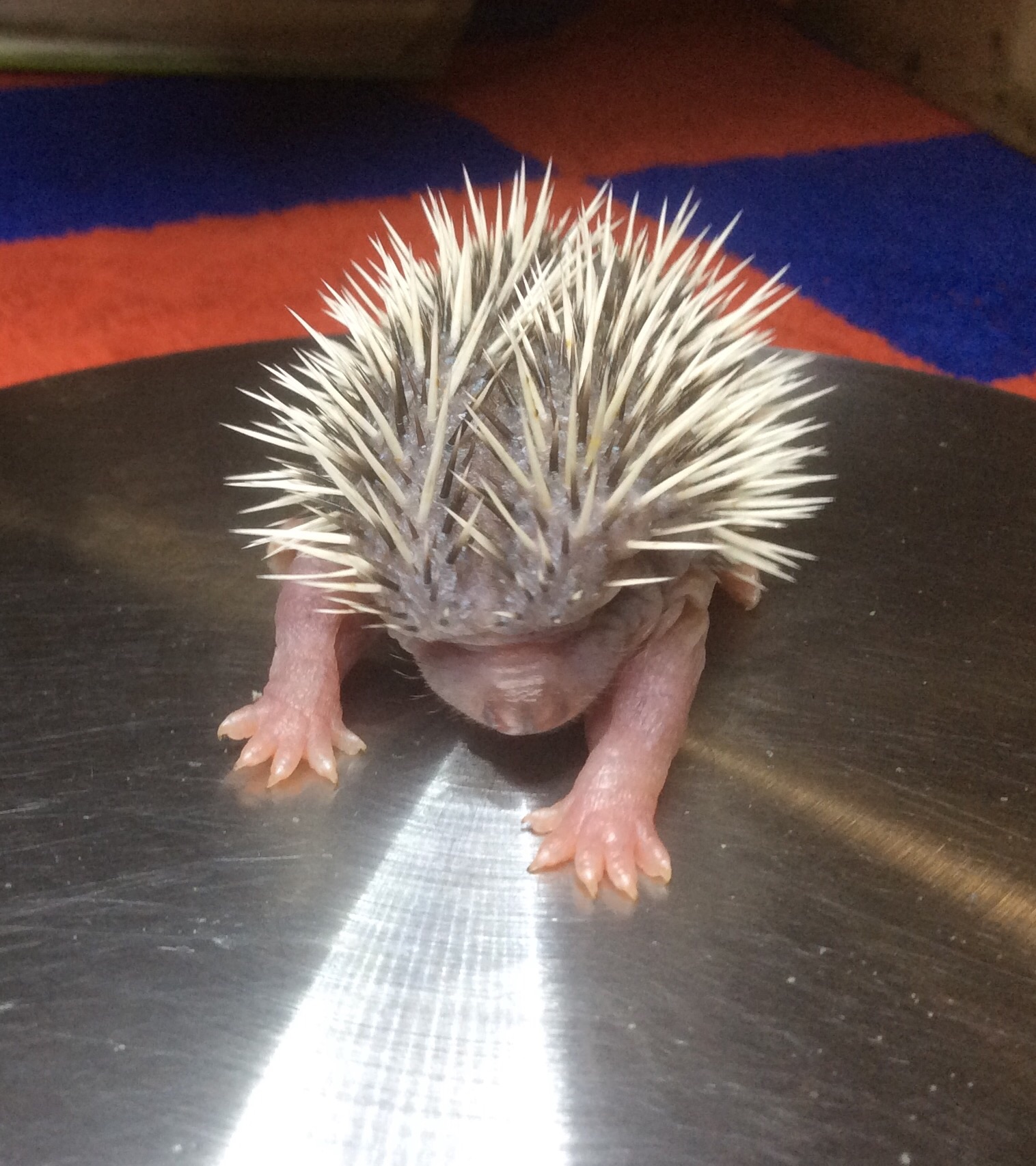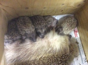Les naissances s’échelonnent du mois de juin jusqu’en septembre, plusieurs portées étant possibles. Les bébés ayant perdu leur maman, sont nombreux à arriver au centre. Plus petits ils sont, plus l’attention nécessaire est soutenue, les biberons s’échelonnant sur toute la journée et toute la nuit, les bénévoles du centre sont alors vraiment appréciés. L’idéal, c’est d’avoir une vraie maman hérisson avec des tétines disponibles en tout temps et du lait parfaitement adapté. En 2015, j’ai eu la chance d’accueillir ainsi deux mamans qui toutes deux ont adopté des bébés orphelins. La palme revenant sans conteste à May. Après avoir été blessée par une débroussailleuse à fil, et été soignée durant plus d’un mois au centre, elle a donné naissance à deux petits et en a « adopté » 3 autres. Mise en confiance par sa longue convalescence, elle allaitait ses petits hors du nid pour le plus grand bonheur des enfants en visite au centre.