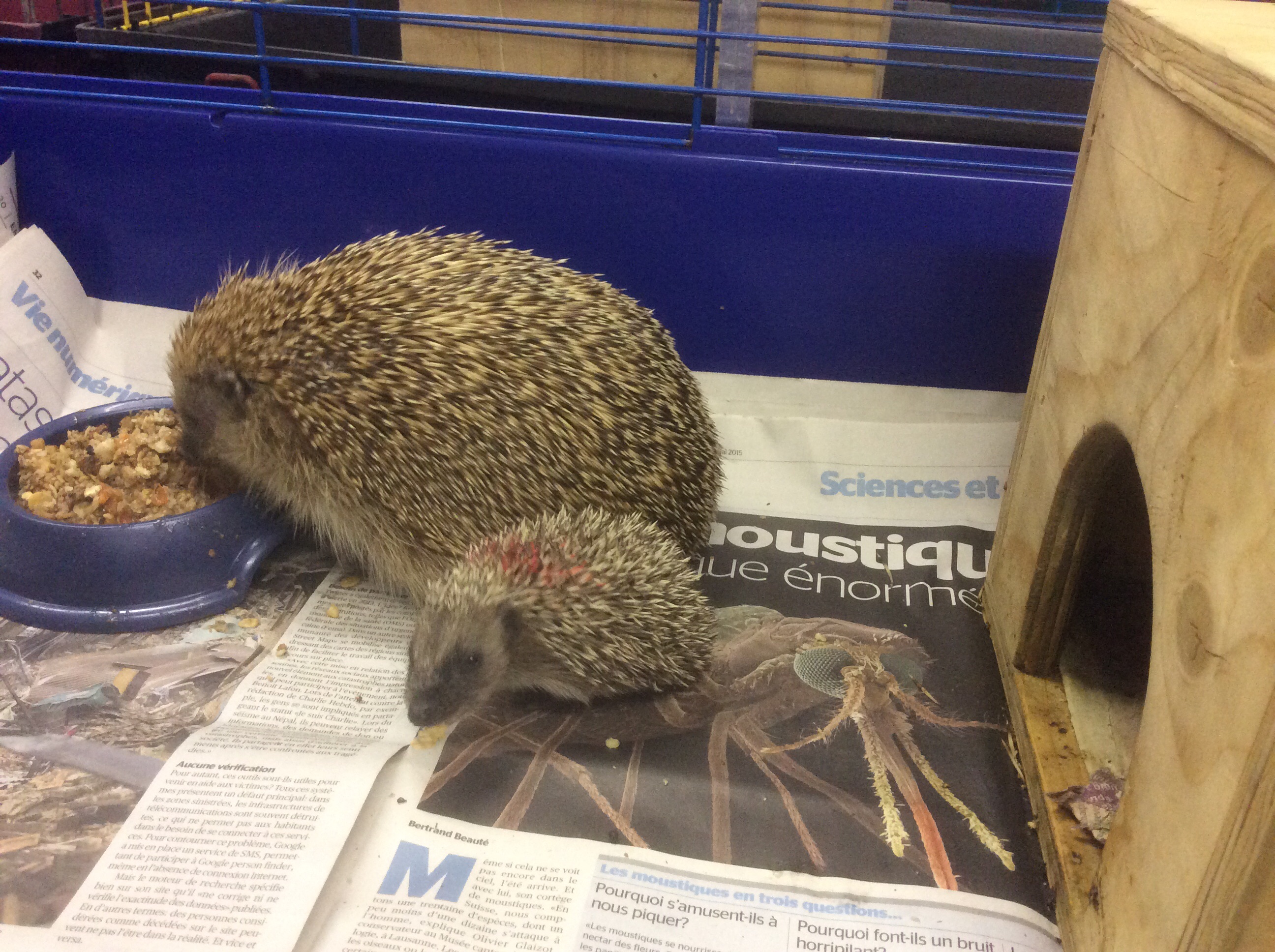 Qu’il s’agisse d’animaux sauvages ou d’élevage, c’est tous les jours qu’il faut s’en occuper pour les abreuver et les nourrir. Au centre, chaque hérisson a sa cage individuelle et un petit abri doté au besoin d’un coussin chauffant si l’état de l’animal le requiert. Tous les jours, les cages sont nettoyées et les hérissons pesés régulièrement. Les premiers jours sont les plus critiques, selon la gravité des blessures, un passage chez le vétérinaire est nécessaire, sinon la plupart des soins sont prodigués au centre. Environ 169 hérissons ont accueillis en 2015, soit un tous les deux jours, on est bien loin des 16 hérissons accueillis en 2007 ! 88% ont pu retrouver la liberté.
